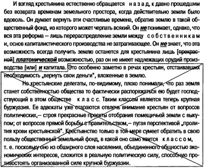 Конечно, это должно было насторожить редактора и заставить его заглянуть в первоисточник. Если бы он это сделал, то изумлению его не было бы предела. Потому что текст, откуда извлечен фрагмент исправленного Лениным текста, выглядит в первоисточнике так (выброшенный Лениным текст перечеркнут, а вставленный взамен выброшенного набран курсивом и подчеркнут):