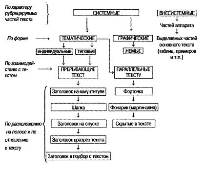 Редактору важно помнить два основных требования к оформлению рубрикации: во-первых, чтобы заголовки рубрик разных ступеней четко различались и читатель мог сразу определить, с рубрикой какой ступени он имеет дело; во-вторых, чтобы выбранные виды рубрик были функционально и экономически целесообразными.