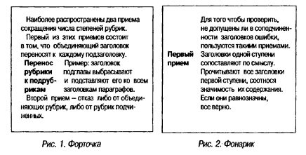 Именно в силу требования краткости в редакционной практике нашел применение прием сокращения в заголовках низших ступеней слов, которые дублируют слова заголовка старшей ступени. Например, в оригинале книги «Внешнее оформление советской книги»: